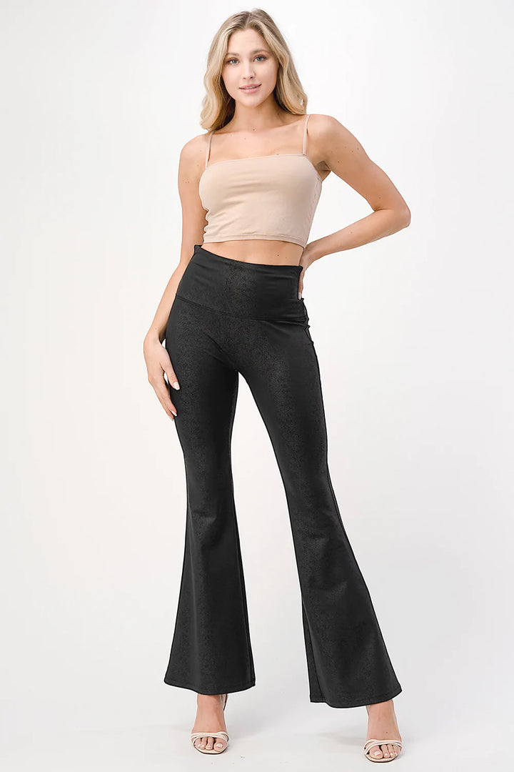 The leatherette leggings have the best fabric that shapes, supports, and keeps you looking good yet comfortable all day long. Features a six-inch tummy-control waistband and a leather-like sheen. An absolute MUST-HAVE for your collection! This design features a distressed leather look and a super fun and flirty bell bottom hem.